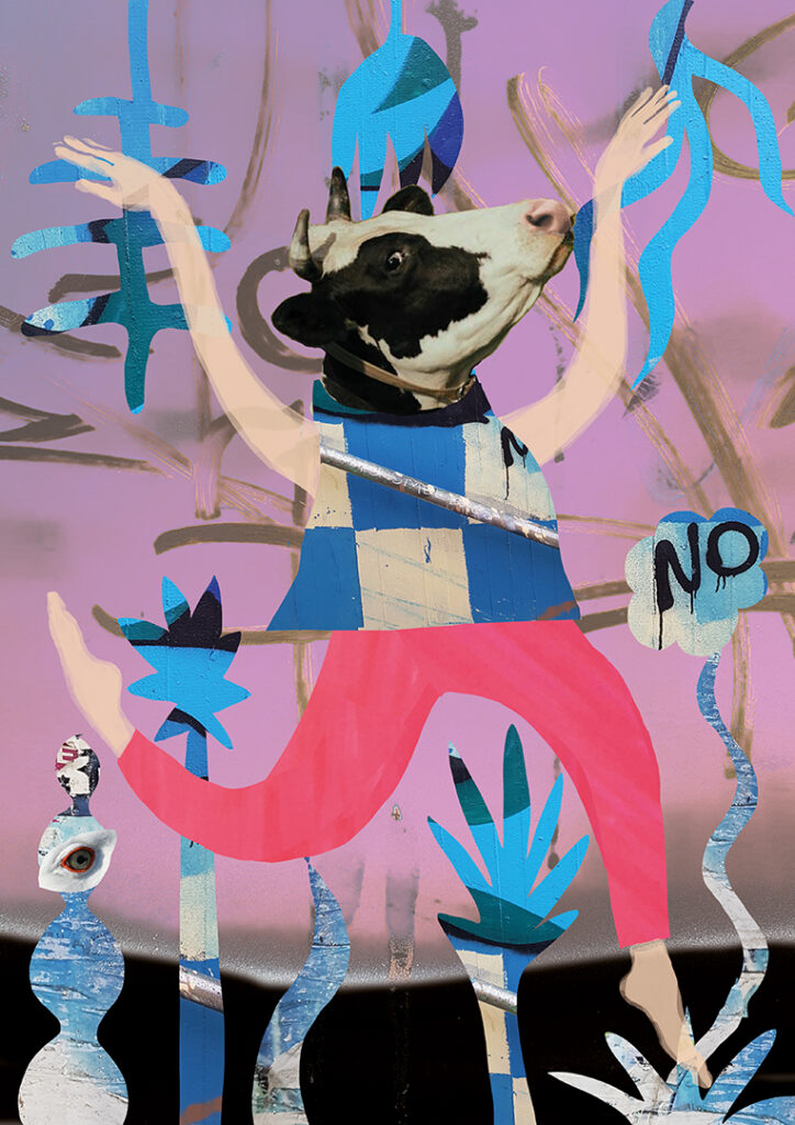 Zuerst entstehen digitale Collagen, für die Anna Salto Fotos von Graffities, gescannte Texturen und anderes Collagematerial mit digitaler Malerei kombiniert. Diese digitalen Kunstwerke verwendet sie dann als Vorlagen für ihre großformatigen Leinwandbilder.
