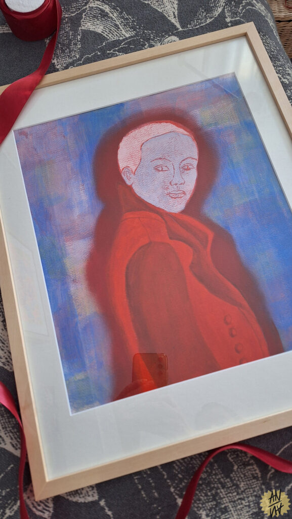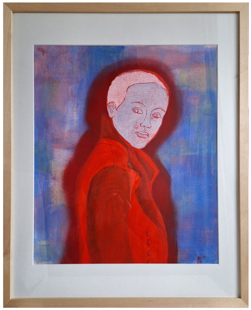 „Aura“, 29,7 x 42 cm Acryl und Sprühfarbe auf Aquarellpapier, gerahmt im Birkenholzrahmen, 2025